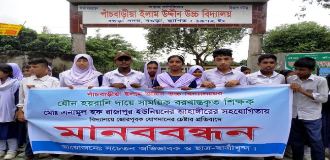 বগুড়া সদরের পাঁচবাড়ীয়ায় যৌন হয়রানির অভিযোগে বরখাস্ত শিক্ষক জোরপূর্বক যোগদানে শিক্ষার্থীদের মানববন্ধন